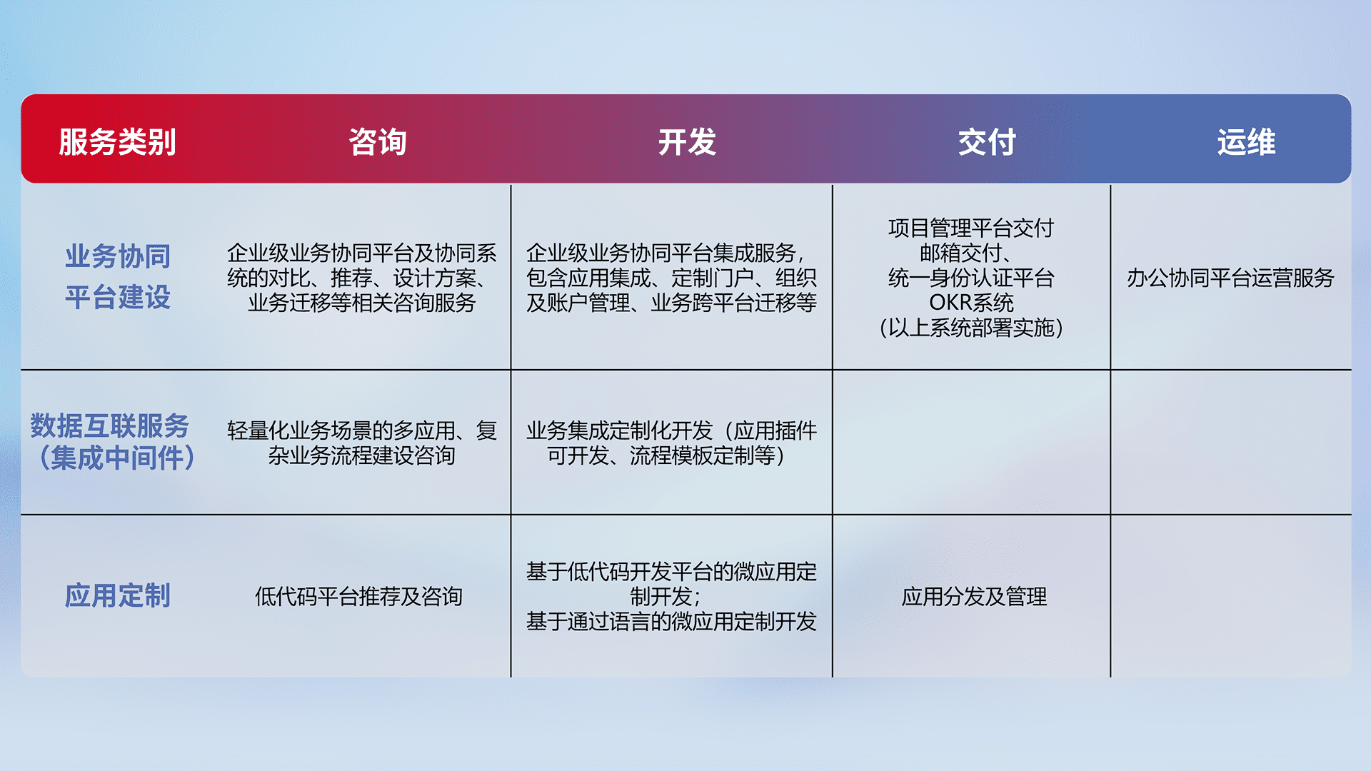 针对钉钉、、企微、、IDaas等平台级产品提供产品的规划、、、方案、、交付、、定制化开发等服务,,,,实现如统一协同办公、、、智能客户服务、、、、混合会议管理、、、智能数据查询、、等业务场景,,实现数字化转型。。