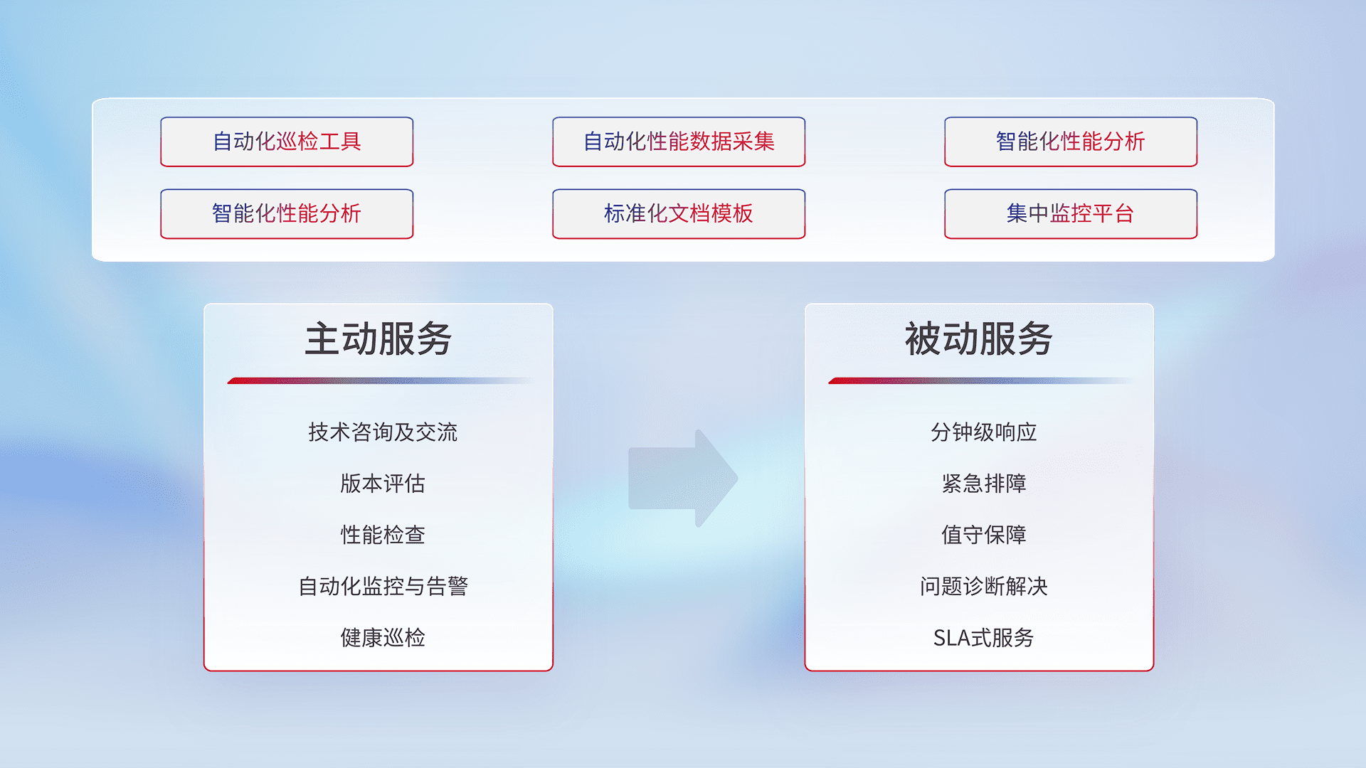 智能化工具和标准化文档,,,保障服务质量,,提供主动服务(包含技术咨询、、版本评估、、、、性能检查、、、自动化监控与告警、、健康巡检)和被动服务包含(分钟级响应、、、、紧急排障、、、、值守保障、、、问题诊断解决、、、SLA服务)。。。