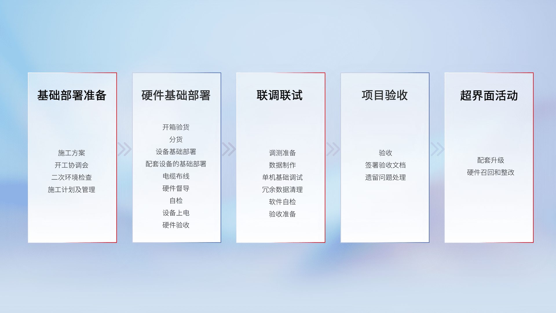 从基础部署准备、、硬件基础部署、、联调联试、、、、项目验收、、、越界面活动的全过程可追溯,,保证施工质量和进度。。。。